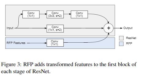 递归特征金字塔(RFP)主要将反馈连接添加到FPN自下而上的过程中(FPN结构最左侧为普通的卷积网络,默认使用ResNet结构,用作提取语义信息)