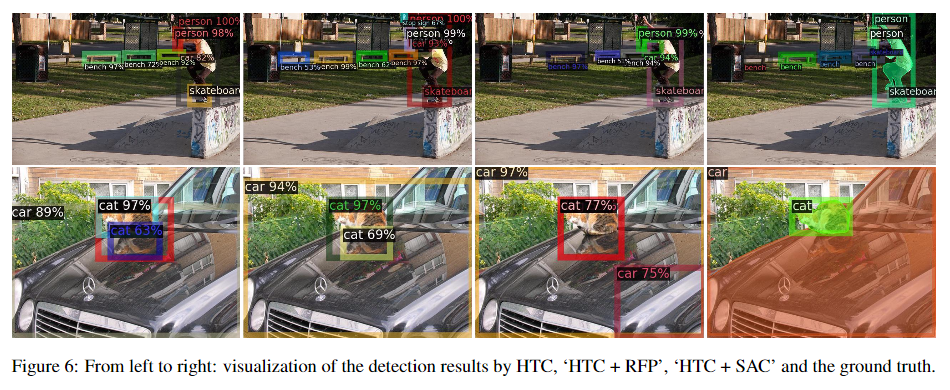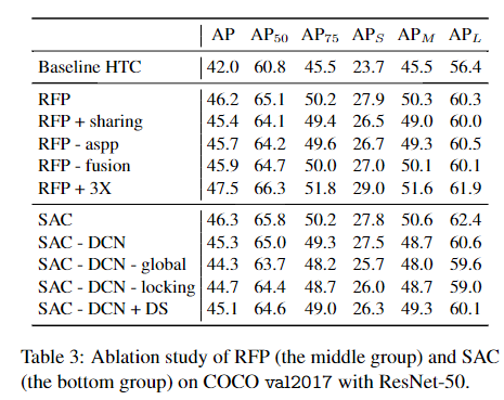 SAC中锁定机制,通过将一个权重设置为w而另一个权重设置为w +Δw,其原因如下:目标检测器通常使用预训练的checkpoint来初始化权重。但是,对于从标准卷积层转换而来的SAC层,较大的空洞率rate的权重通常是缺失的。由于可以通过相同的权重以不同的粗略度粗略地检测出不同比例的物体,因此用预训练模型中的权重来初始化丢失的权重是可以的。本文使用w + ∆w表示从预训练checkpoint开始的缺失的权重,并使用0初始化∆wi。当固定Δw= 0时,通过实验观察到AP下降了0.1%,但是没有锁定机制的∆w会使AP降低很多。