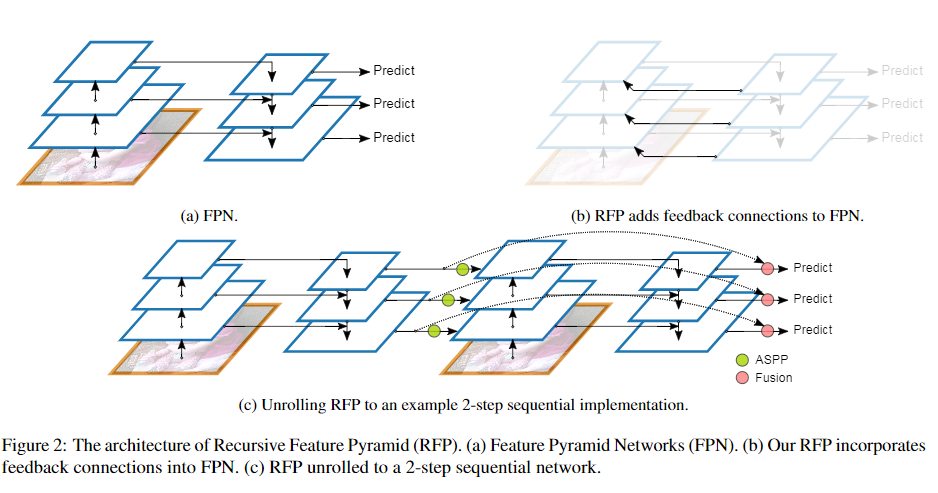 RFP提出的递归方法与最近提出的CBNet 中的递归方法相似,CBNet方法中将多个主干级联以输出特征作为FPN的输入。相比之下,RFP通过包含ASPP结构的FPN和有效的融合模块一起来执行递归计算。