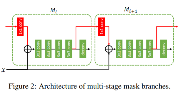 HTC在相邻的 stage 的 mask 分支之间增加一条连接,提供 mask 分支的信息流,让