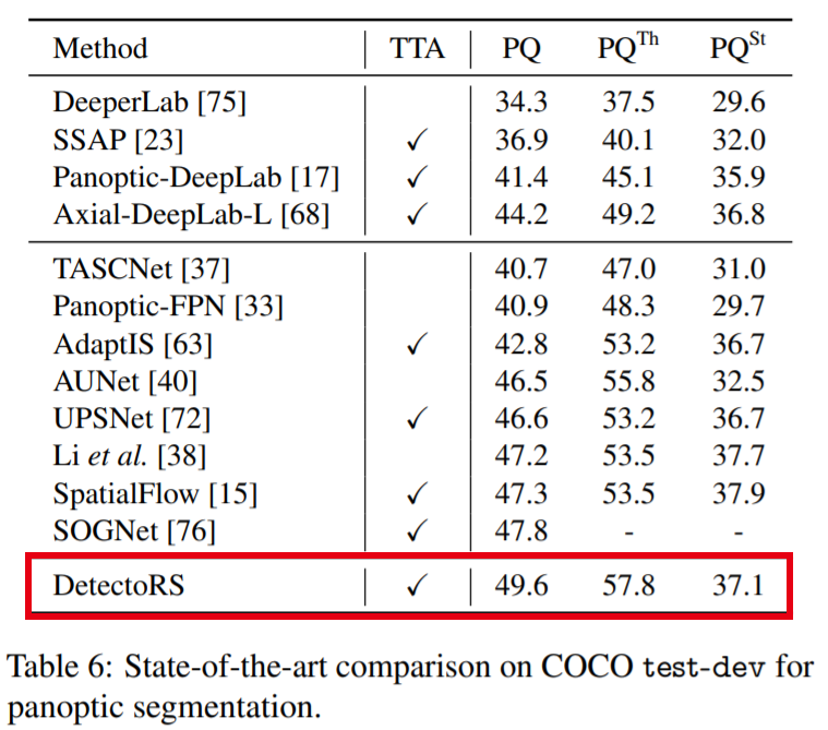 在COCO test-dev 全景分割中,DetectoRS达到49.6% PQ,相比于其他算法有将近两个点的提升。