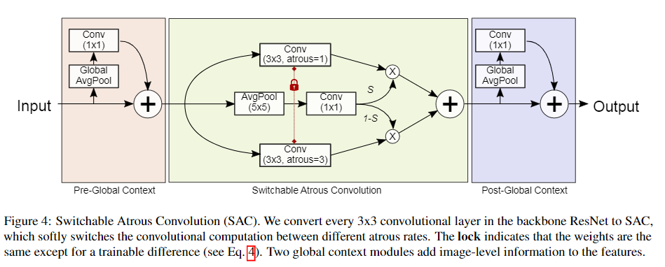 作者将主干网络ResNet中的每个3x3卷积层都转换为SAC,从而在不同的空洞率之间实现对卷积计算的软切换。上图中的锁表示权重相同,只是训练的细节差异有所不同。两个全局上下文模块将图像级信息添加到特征中。