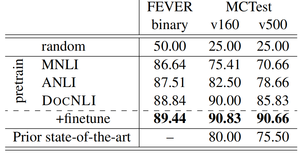 关于数据集训练的模型,对于下游任务是否具有可扩展性,作者使用了FEVER数据集的NLI版本以及MCTest两个数据集作为验证。