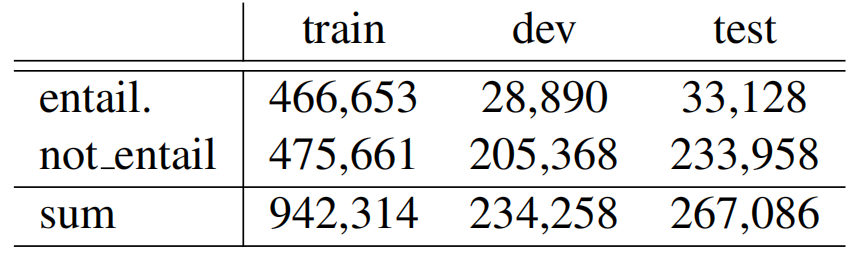 此外,数据集还经过了人工检验,作者从假数据中任意抽取了200条“假”摘要,交给人类评测,评测主要是两条:(1)是否真的不蕴含(2)是否有语法错误。其中200条数据均属于不蕴含,但是仍存在一些语法错误。