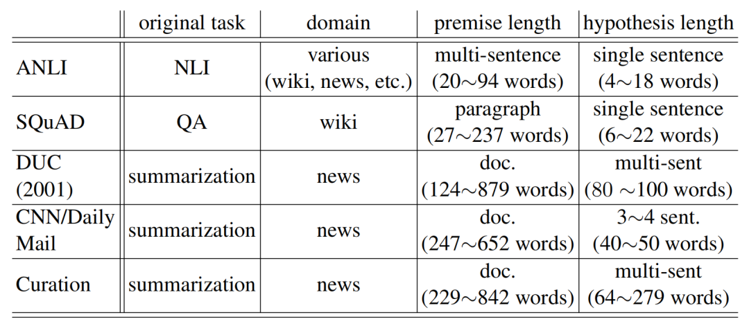 DocNLI是一个由之前已有数据集得出的数据集,它利用了表中所示的这些数据集。
