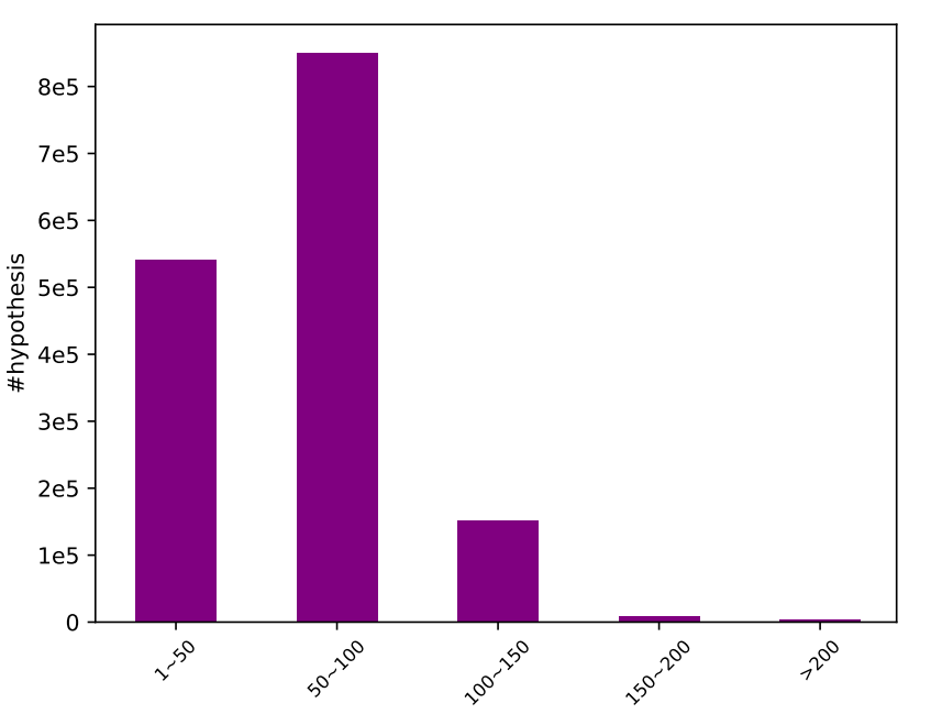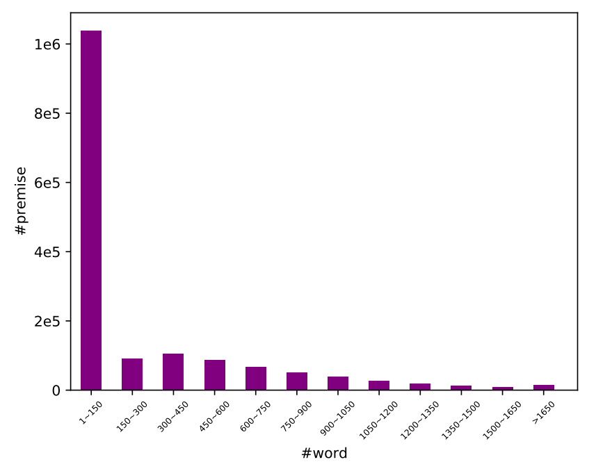 下图4、5显示了DocNLI的文本长度,可以看出前提部分长度普遍较长,假设部分长度长短不一。