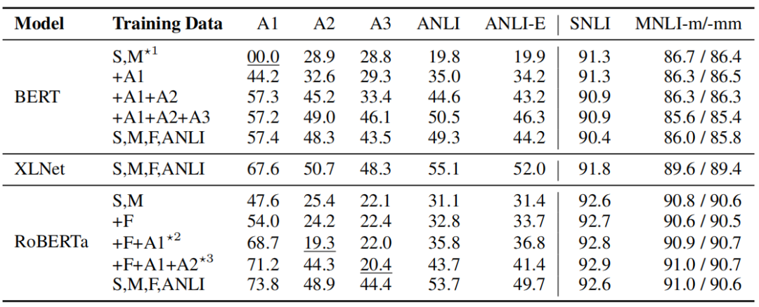 其中S表示SNLI,M表示MNLI,*n表示用这个模型训练了几轮,-E表示加上了特别的测试集标注者的测试集数据。