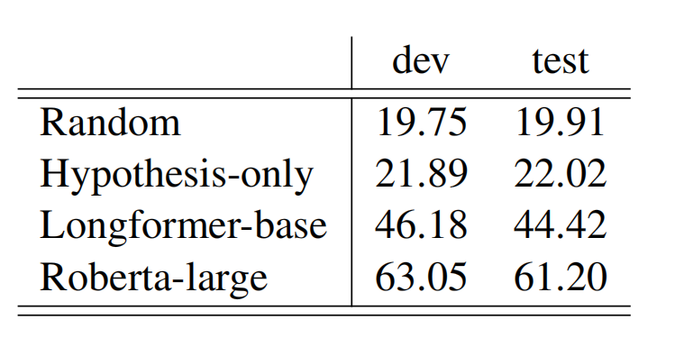 首先,作者使用了在NLI数据集上表现非常好的RoBERTa模型,以及在长文本上表现好的Transformer的变体Longformer,并添加了一组只用hypothesis训练的RoBERTa作为对照组。