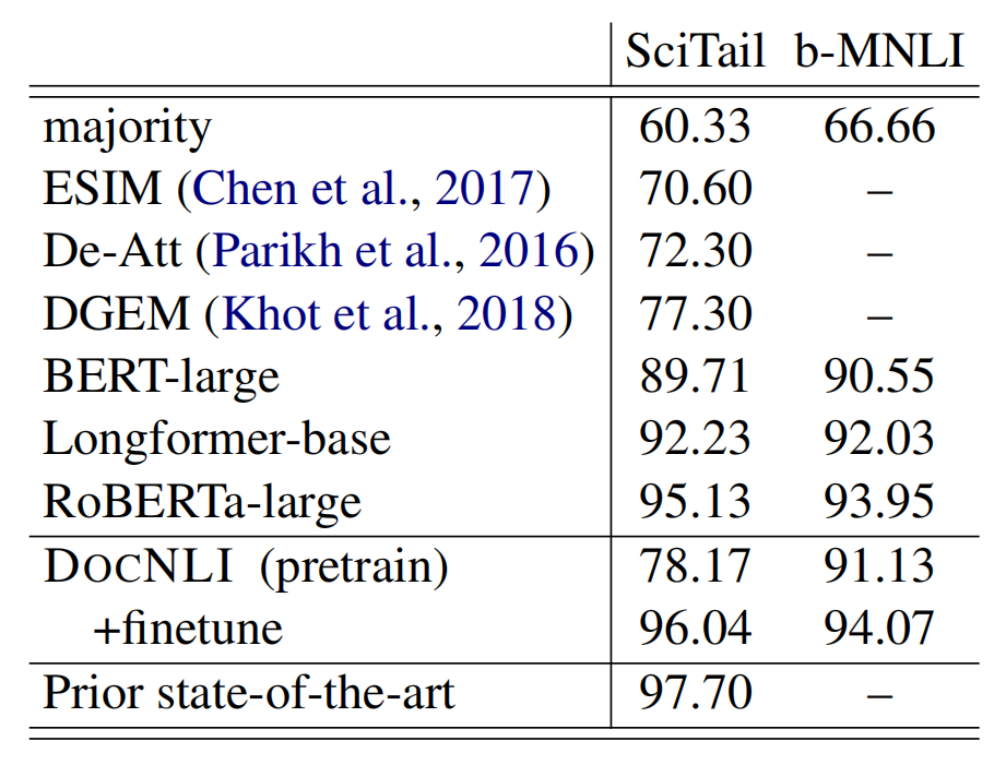 对于构建好的DocNLI,作者利用了一些实验说明该数据集的挑战性,以及数据集训练的模型对于下游任务的可扩展性。