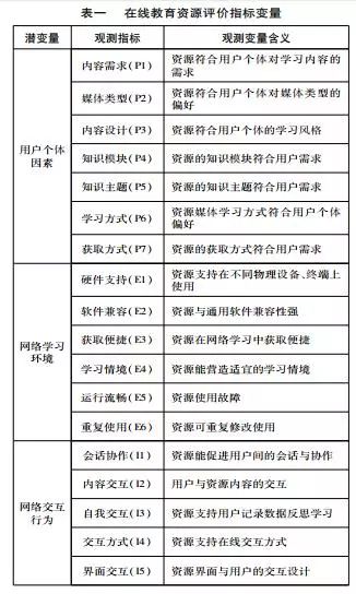 研究中潜变量不能直接作为测量变量,需要通过潜变量的外显指标作为观测变量进行测量。本文从网络学习环境、网络交互行为、用户个体因素三维度梳理在线教育资源质量评价的观测变量(见表一)。