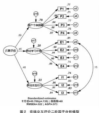 本研究运用软件AMOS18.0建立在线教育资源交互评价二阶因子分析模型,采用最大似然法(Maximum Likelihood,简称ML)对模型进行估计,删除因子负荷未达到标准值的观测指标,将误差值e9与el5之间建立共变关系,修正后得到标准化模型路径参数(见图2)。模型中各项因子负荷介于0.843至0.910之间,符合因子负荷介于0.45至0.95间的适配要求;各误差变异量均为正数,未出现负数的误差变异量。模型修正后,用户个体因素的观测指标为:内容需求(P1)、媒体类型(P2)、内容设计(P3)、知识模块(P4);网络学习环境维度观测指标为:硬件支持(E1)、软件兼容(E2)、获取便捷(E3)、学习情境(E4);网络交互行为维度的观测指标为:会话协作(II)、内容交互(12)、自我交互(13)。