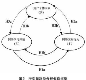 在网络学习中,在线教育资源支持的网络学习环境、网络交互行为、用户个体因素三个因子相互影响,相互作用。资源对网络学习环境的支持影响网络交互行为和用户个体因素;资源对网络交互行为的支持影响网络学习环境和用户个体因素;资源对用户个体因素的支持影响网络交互行为和学习环境。研究对三个内生潜变量做路径分析(见图3),深入分析教育资源设计建设中需优先考虑的因子和因子间的相互作用。研究假设如下: