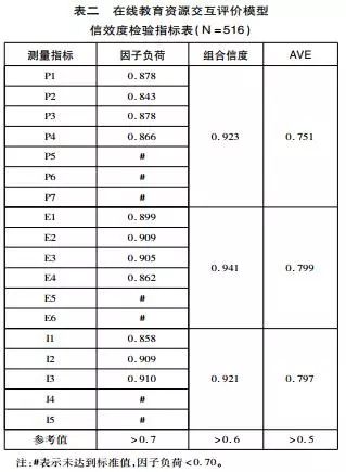 本研究选取因子负荷、组合信度、平均方差提取量(Average Variance Extracted,简称AVE)三个指标作为信度效度检验指标。平均方差提取量是模型收敛效度指标,其数值越大表示指标越能反映其共同因素构念的潜在特质(吴明隆,2010)。各观测指标中E5、E6、I4、I5、P5、P6、P7的因子负荷未达到标准值。E1、E2、E3、E4的组合信度为0.941,平均方差提取量AVE值为0.799;11、12、13的组合信度为0.921,平均方差提取量人¥£值为0.797;?1、?2、P3、P4的组合信度为0.923,平均方差提取量AVE值为0.751(见表二)。各潜变量的组合信度均大于0.6,平均方差提取量均大于0.5,表示模型的内在质量理想。