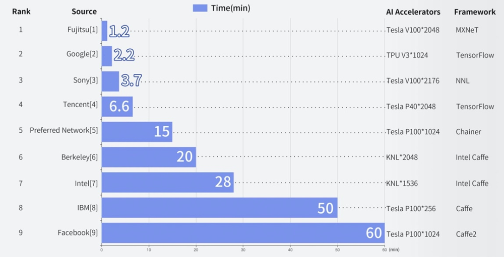 最快的富士通依靠2048块TeslaV100 GPU和新颖的通讯算法优化在1.2分钟完成了图像分类模型训练。