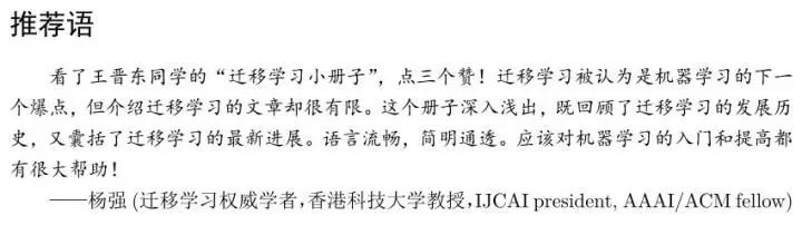 “看了王晋东同学的 “迁移学习小册子”,点三个赞!迁移学习被认为是机器学习的下一个爆点,但介绍迁移学习的文章却很有限。这个册子深入浅出,既回顾了迁移学习的发展历史,又囊括了迁移学习的最新进展。语言流畅,简明通透。应该对机器学习的入门和提高都有很大帮助!”