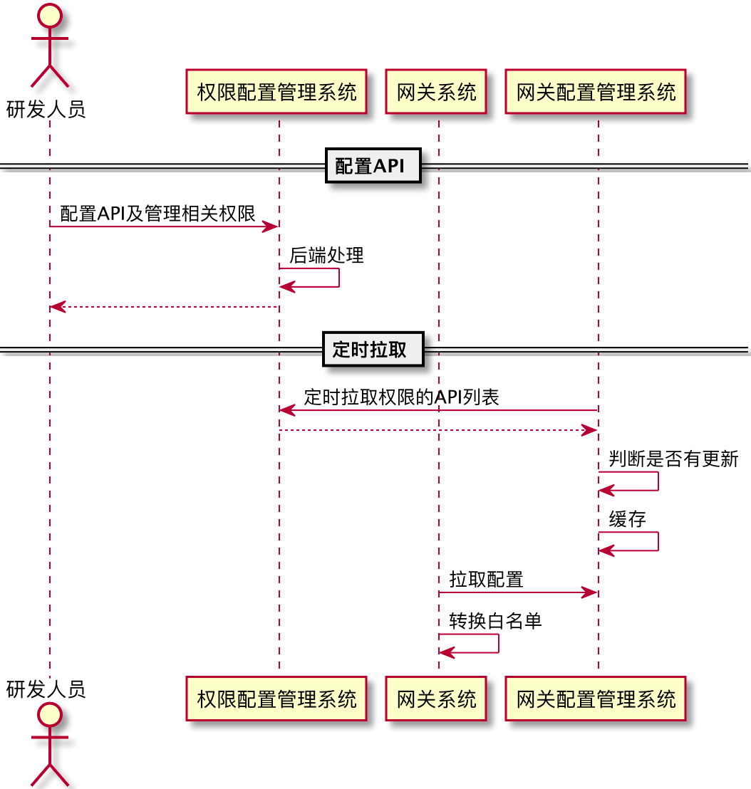 为此,还呗把网关配置与权限系统配置打通,只保留权限配置系统的配置入口,网关配置管理系统则定时拉取权限 API,之后转换成网关 API 白名单配置。这样做不仅能减少用户一次配置操作,同时也协助权限系统进行了权限管控。可以保证在运营页面调用的后端 API,一定是在权限系统配置了相关权限。