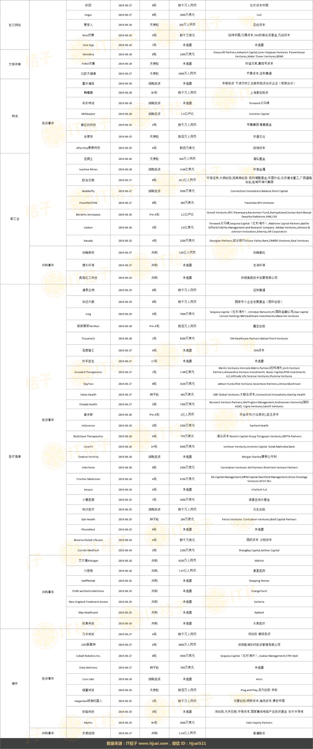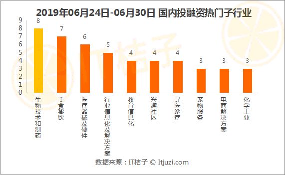 上周最受投资人追捧的子行业依次是生物技术和制药、美食餐饮、医疗器械及硬件、行业信息化及解决方案、教育信息化、兴趣社区、寻医诊疗、宠物服务、电商解决方案、化学工业。