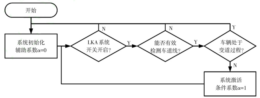 LKA 系统需要具有开关接口以保证驾驶员随时可以开启或关闭系统,避免系统对驾驶员持续产生干扰甚至引发事故。从人机交互装置接收 LKA 系统的开关信号,如果驾驶员关闭 LKA 系统,则激活条件系数 α=0。