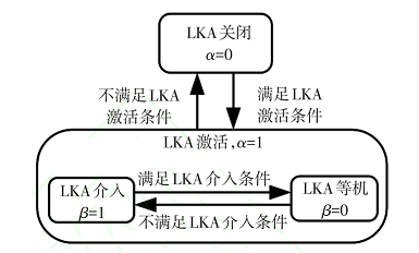 图 3 中的状态决策策略如图 4 所示,LKA 系统具有关闭、待机和介入 3 种状态,状态的转换根据 LKA 激活条件和介入条件判断进行。定义激活条件系数 α 和介入条件系数 β,辅助系数 γ 为 α 和 β 的逻辑与,即开启条件和介入条件同时满足时,取 γ=1(介入状态),否则取 γ=0(非介入状态),γ 直接影响车道保持辅助控制器输出的力矩。