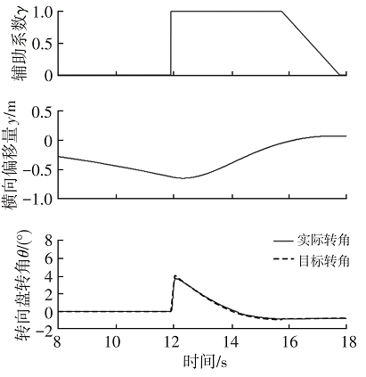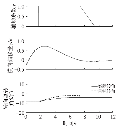 车速 70 km/h 直线道路仿真结果如图 11 所示,车辆逐渐偏离车道,第 12 s 时介入条件满足,辅助系数 γ 由 0 调整为 1,此时车辆偏出车道中心线约 0.7 m,LKA 系统开始介入。转向盘转角变化率受到限制,转角平稳变化,车辆平缓返回车道中心线附近,此后,LKA 系统主动平缓退出。