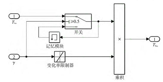 为了便于对系统状态转换的过渡过程进行设计,输出力矩决策单元采用文献 [8] 提出的 LKA 力矩叠加结构。根据工作状态和虚拟车道跟随力矩获得车道保持辅助力矩 T_lka=T_ha·γ。输出力矩决策单元的输入 γ 和 T_ha,输出为 T_lka。当 γ=1 时,LKA 系统输出辅助力矩 T_lka 即为虚拟车道跟随驾驶员力矩 T_ha;当 γ=0 时,车道保持系统输出的辅助力矩 T_lka 为零。