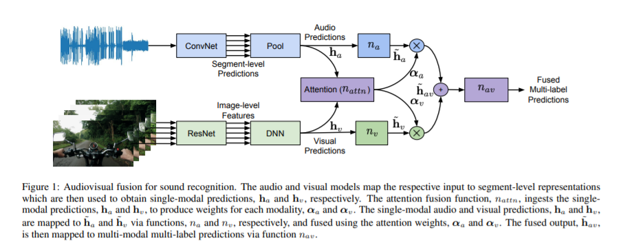 识别声音是计算音频场景分析和机器感知的一个关键方面。在本文中,我们主张声音识别本质上是一个多模态的视听任务,因为它更容易区分声音使用音频和视觉模态,而不是一个或另一个。我们提出了一种视听融合模型,该模型能够从弱标记的视频记录中识别声音。所提出的融合模型利用注意力机制,将单个音频和视频模型的输出动态地结合起来。在大型音频事件数据集AudioSet上进行的实验证明了该模型的有效性,其性能优于单模态模型、最先进的融合和多模态模型。我们在Audioset上实现了46.16的平均精度(mAP),比之前的技术水平高出大约4.35个mAP(相对:10.4%)。