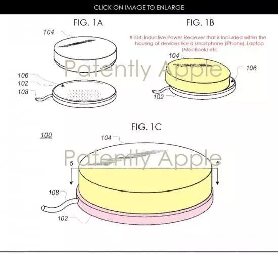 今年 4 月,苹果被曝光了一种可以为 iPhone 和其他设备充电的充电器。按照苹果专利的描述,图中黄色部分为感应充电接收器,可以置于 iPhone、MacBook 机体中或者 iPhone 保护壳中,底部的粉色部分为无线感应式充电器。苹果认为该专利中提到的无线充电技术可以用于智能手机、平板电脑、笔记本电脑、可穿戴设备、导航设备、运动设备、健康设备、医疗设备、配件设备、周边输入设备等等。
