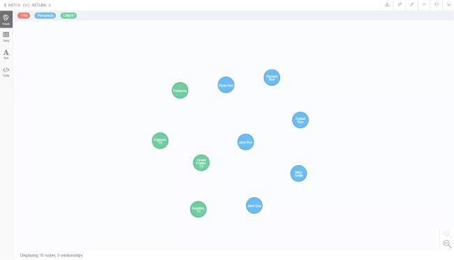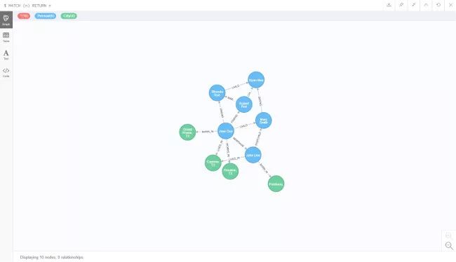 在上面一共创建了 10 个节点和 13 个属性。想查看它们? 通过下面语句来匹配查询所有节点: