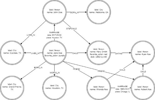 MATCH (a:Person),(b:Person),(c:Person),(d:Person),(e:Person),(f:Person),(t:City),(u:City),(v:City),(w:City) WHERE a.name='Jane Doe' AND b.name='John Doe' AND c.name='Mary Smith' AND d.name='Robert Roe' AND e.name='Rhonda Roe' AND f.name='Ryan Roe' AND t.name='Petaluma, CA' AND u.name='Cypress, TX' AND v.name='Grand Prairie, TX' AND w.name='Houston, TX' CREATE (d)-[m2:MARRIAGE {date: '1990-12-01', place: 'Chicago, IL'}]->(e) CREATE (a)-[n:CHILD]->(c) CREATE (d)-[n2:CHILD]->(f) CREATE (e)-[n3:CHILD]->(f) CREATE (b)-[n4:STEPCHILD]->(c) CREATE (a)-[o:BORN_IN]->(v) CREATE (b)-[o2:BORN_IN]->(t) CREATE (c)-[p:DATING]->(f) CREATE (a)-[q:LIVES_IN]->(u) CREATE (b)-[q1:LIVES_IN]->(u) CREATE (a)-[r:WORKS_IN]->(w) CREATE (a)-[s:FRIEND]->(d) CREATE (a)-[s2:FRIEND]->(e)