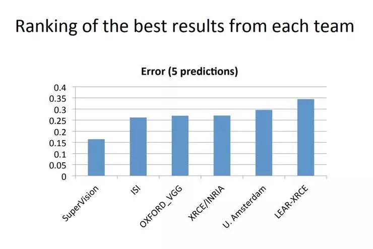 Hinton:嗯这之后我们就开始在各种问题上尝试这个方法。最早用神经网络做语音识别的是 George Dahl,他开始用神经网络预测一个分子是否会连接到某些东西上面然后起到治疗的作用。当时有一个做这个的竞赛,他就直接把用于语音识别的标准方法用来预测药物分子的活性,然后就这么赢了竞赛。这是一个很积极的信号,神经网络的方法似乎有很高的通用性。这时候我有一个学生说,「Geoff,我感觉用这个方法去做图像识别也会效果很好,李飞飞也已经创建了一个合适的数据集,还有一个公开的竞赛,我们一定要去试试」。我们就参加了,得到的结果比标准计算机视觉方法好很多。(AlexNet 在 2012 年的 ImageNet 大规模视觉识别挑战赛 ILSVRC 中以远好于第二名的成绩取得第一,下图中 SuperVision 团队)