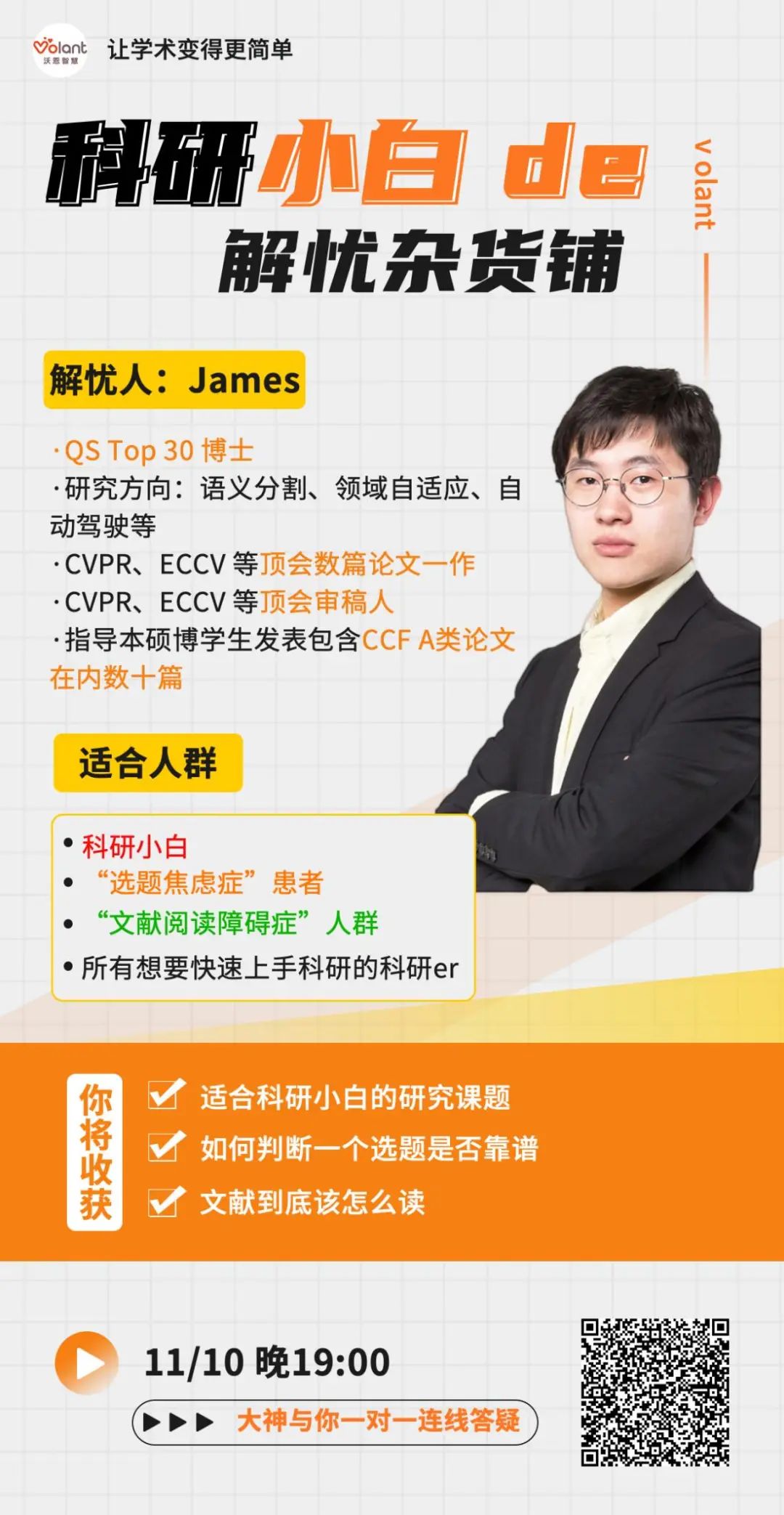 因此,11月10日,沃恩智慧教研负责人、顶会论文第一作者、顶会审稿人James老师,将在直播间针对大家的问题一一连麦答疑解惑。