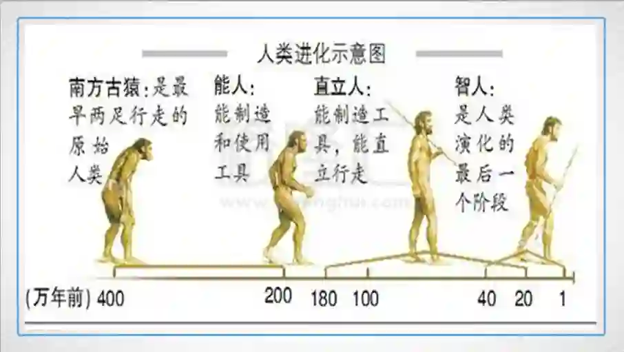 人类学上对人类的进化分为四个阶段,南方古猿,能人,直立人,智人。
