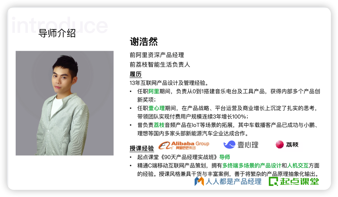 我们特邀前阿里资深产品经理@谢浩然老师授课,谢浩然老师拥有13年互联网产品设计及管理经验,历任阿里资深产品经理、壹心理产品总监、荔枝智能生活业务负责人等。