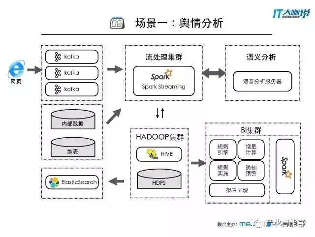 爬虫爬到kafka里面,进行流处理去虫去噪,再做语义分析,语义分析完之后将舆情数据写入ES,全量数据写入HDFS。