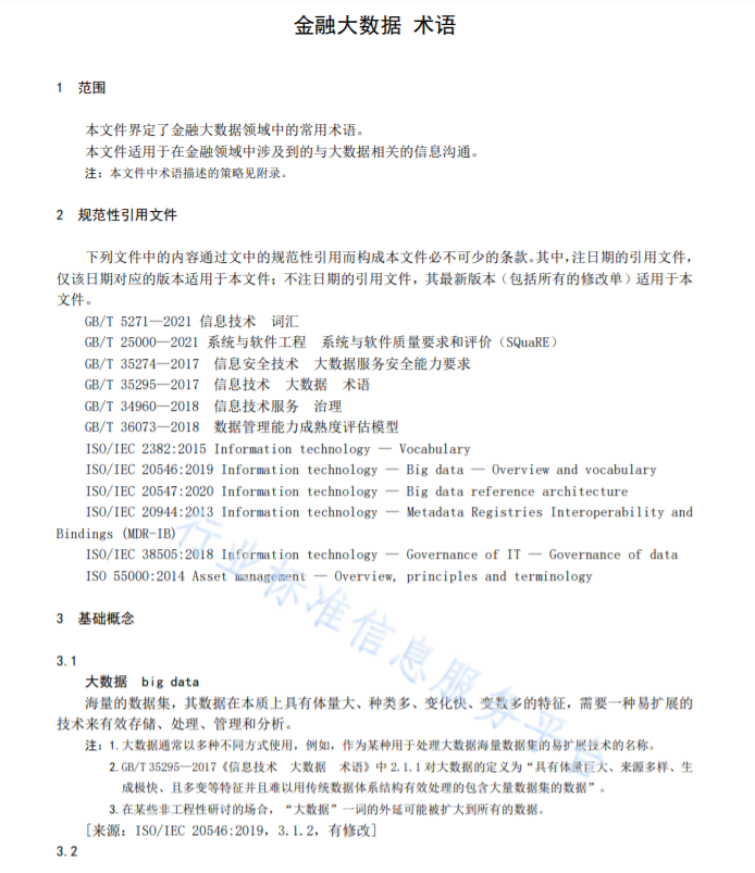 随着大数据技术在金融领域的广泛深入应用,大数据技术已经成为促进金融科技创新,驱动监管科 技智能化的重要技术支撑,在规范社会治理、提供金融服务等方面发挥着重要作用。在金融应用场景下, 一方面,大数据术语可能会被赋予特定的金融含义,部分术语从信息技术视角看不属于狭义的大数据概 念,需要进一步定义,供金融行业参考;另一方而,在不同的场合,对大数据的概念存在不同的表述, 导致在大数据管理与使用等过程中对大数据的实质性内容认知不同,可能影响信息传导和业务需求的表 达。基于以上原因,有必要尽快统一金融领域大数据相关概念,促进快速形成共识。本文件在收集现有国家标准、行业标准以及国际标准中大数据相关术语的基础匕 通过分析归纳, 结合我国金融应用特点,形成了金融大数据的术语标准。本文件通过描述金融大数据的基础概念、参考体系和生命周期、治理与管理、支撑运行环境等方面 的常用术语,以期知减少相关人员在沟通中的分歧,促进大数据在金融行业中的应用。。