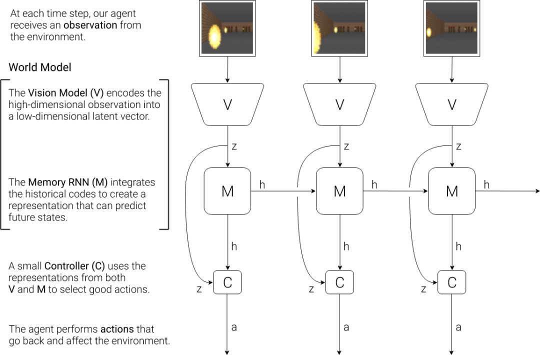 在这个模型中,智能体有一个视觉感觉组件,将它看到的东西压缩成一个小的代表代码。还有一个记忆组件,根据历史信息对未来的代码进行预测。最后是一个决策组件,只根据其视觉和记忆组件所创建的表征来决定采取什么行动。