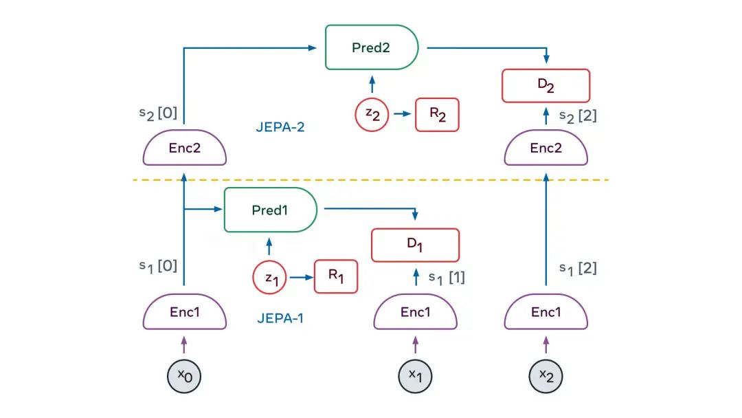 这使得JEPA可以相互堆叠,用来学习具有更高层次的、能藉以执行更长期预测的抽象表示。