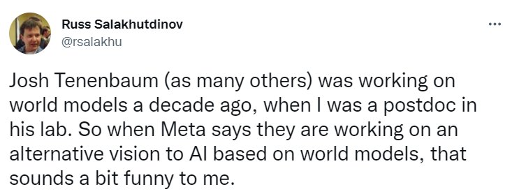 多伦多大学的副教授Dan Roy指出,「我好像记得Josh Tenenbaum确实提过世界模型。当然也可能我记错了。」