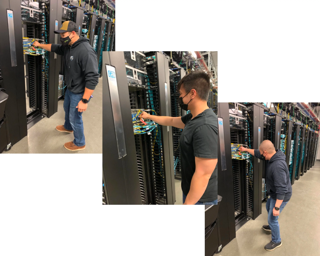 从左至右,Eddie、Victor 和 Jimmy 三位同事在 SJC 三处数据中心内同时拔下网络光纤。