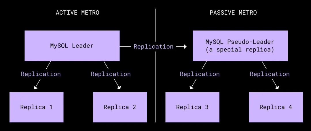 我们的元数据堆栈建立在两个大型分片 MySQL 部署之上。其一用内部数据库 Edgestore 承载着通用元数据,其二则负责承载文件系统元数据。集群中的每个分片由六台物理设备组成:两个核心区域,各自对应一台主机 primary 和两台副本 replica。