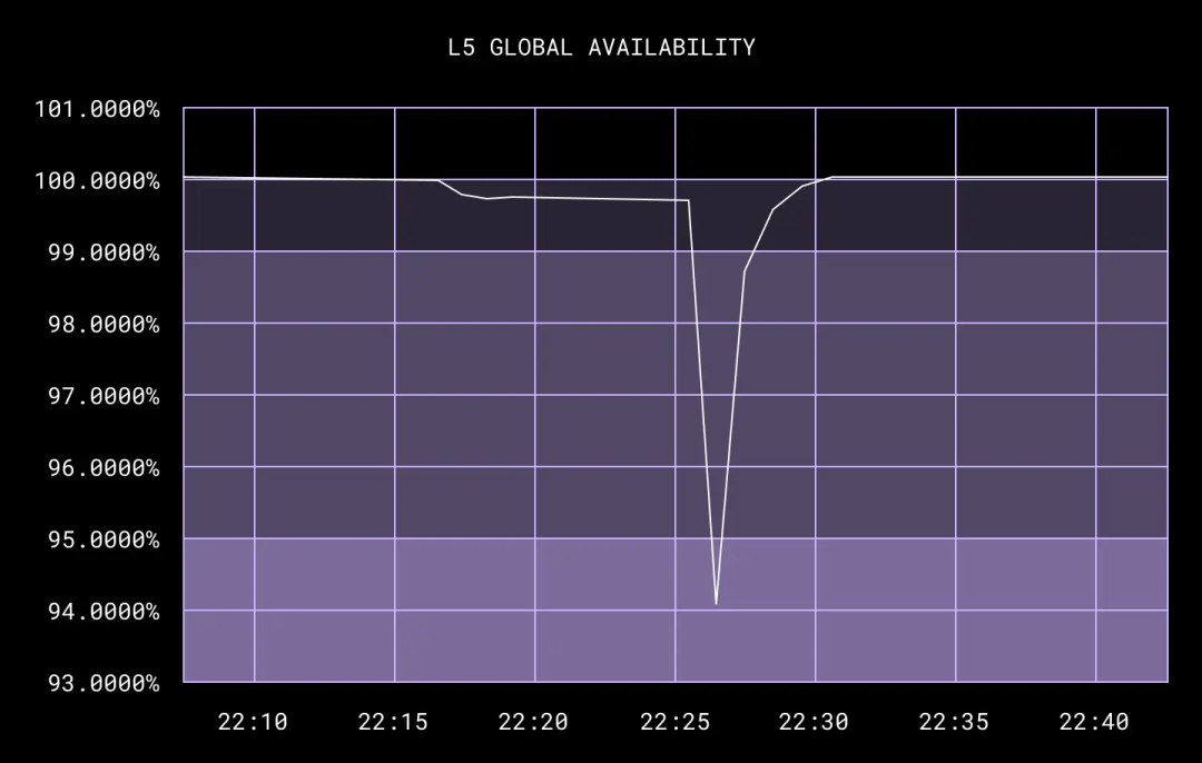 最终,太平洋时间下午五点,三处设施同时断开了网络连接。跟第二轮 DFW 测试时一样,我们还是没看到全局可用性出现太大的波动——SJC 黑洞测试的 30 分钟目标同样顺利达成!