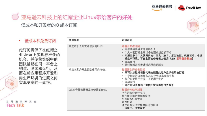 对于广大 RHEL 用户,亚马逊云科技上的红帽 RHEL 提供了覆盖全面、非常灵活的订阅计划。尤其面向个人开发者和企业开发者,红帽都准备了 0 成本的开发者可用订阅。