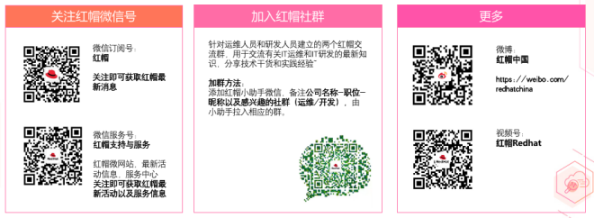 以下是红帽官方渠道相关的二维码,感兴趣的读者可以扫码加入: