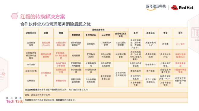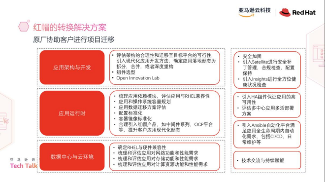 红帽会帮助用户进行项目迁移引导或者规划,提供一系列帮助和全方位管理服务。红帽在数据中心运营环境基础设施方面会帮助用户做评估梳理,在运行时方面帮助用户考察应用兼容性、迁移方案可行性,在应用开发优化方面也有相应的咨询协助。