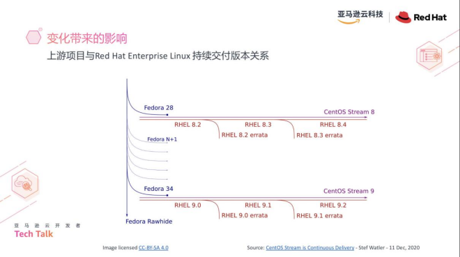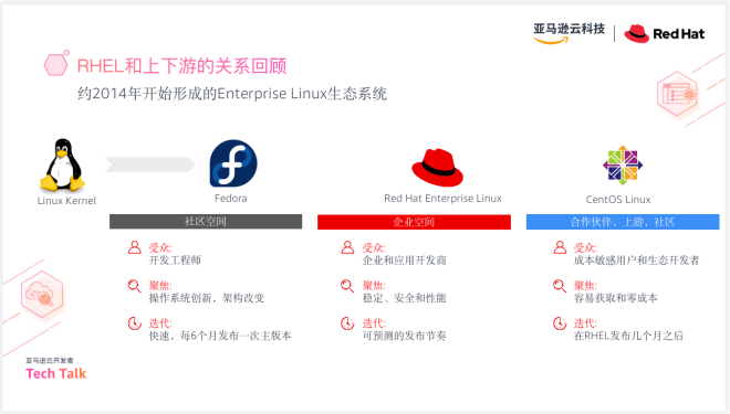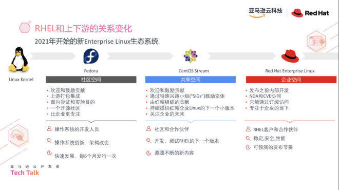 很多开发者无法理清 Linux 生态系统中各种版本之间的关系。那么我们首先做一个回顾,从 2014 年开始,红帽企业级 Linux 生态系统形成了 Fedora、RHEL 和 CentOS Linux 协同发展的局面。社区上游通过 Fedora 面向广大开发工程师提供桌面操作系统的持续创新和技术架构整合,大约每 6 个月发布一个版本;中游是红帽企业级 Linux,主要面向广大企业和应用开发商,特点是稳定、安全和性能优化,产品迭代和发展节奏有条不紊;下游就是社区领导的 CentOS Linux ,面向成本敏感用户和生态开发者。CentOS Linux 版本,产品迭代节奏紧跟 RHEL,用户在零成本获取的同时,一样可以享受到红帽 RHEL 的产品优势。