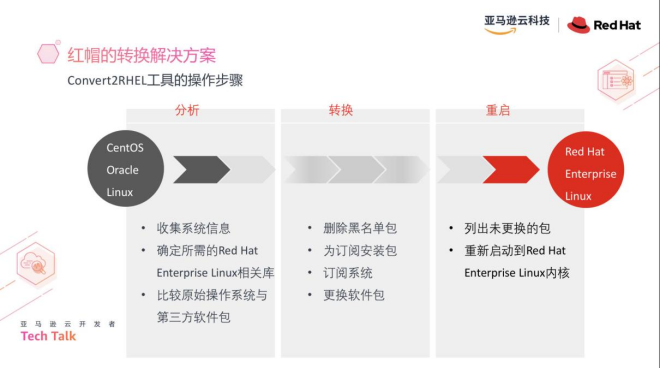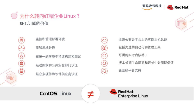 如果用户选择从 CentOS 转向 RHEL,亚马逊云科技提供一些工具来帮助用户完成任务,确保用户享受到红帽订阅的价值。