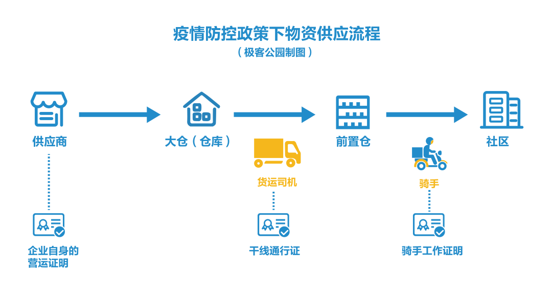 项目组同事就会多方协调,最终找到有通行证的骑手帮忙在两个区域之间接驳,把物资送到用户手上。