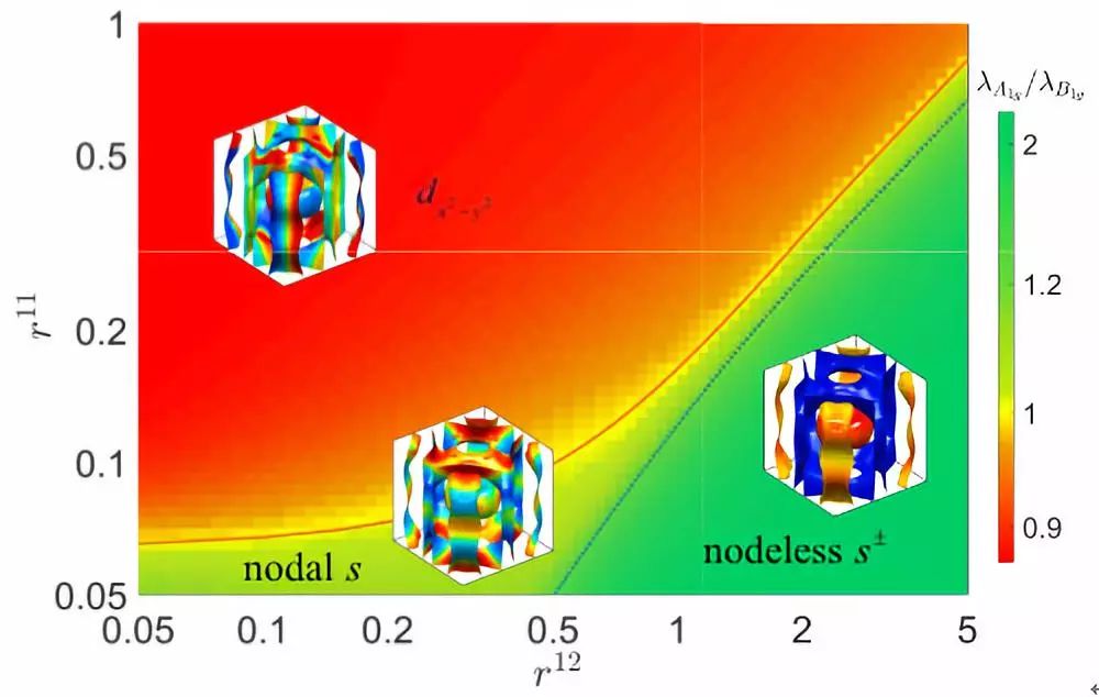 图3:常压下 CeCu2Si2 超导的理论相图,强带间散射可以导致无节点 s± 波解,图中d波区间的范围被高估。