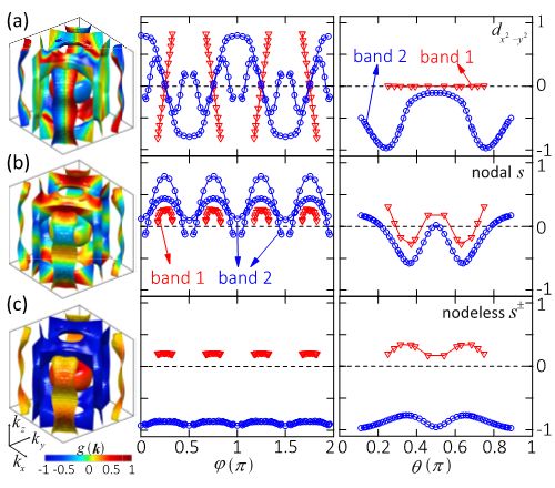 这些新的实验结果否定了传统的单带 d 波配对的简化图像,表明多个费米面的存在对超导配对具有重要的影响。但是基于第一性原理和随机相或微扰近似的计算只能得到 d 波或具有环形节点的 s 波解,与实验不符。为了解决这一问题,中国科学院物理研究所/北京凝聚态物理国家研究中心极端条件物理重点实验室 EX9 组的杨义峰研究员指导博士研究生李宇与刘敏(联合培养)对CeCu2Si2 超导配对及其能带结构进行了深入分析。他们同时考虑了体系中的电子和空穴型费米面,发现当两个费米面之间存在较强的库珀对散射时,可以得到无节点的 s± 波解,其能隙比值也与实验相符,首次为解释实验提供了可能的理论基础。新理论还认为先前计算所得到的 d 波和环形节点 s 波解分别来自于电子和空穴型费米面本身,在压力下,电子型费米面消失,超导会从无节点 s±波过渡到仅由空穴费米面诱导的有节点 s 波配对,从而解释高压下观测到的新超导相。这一结果表明在实际重费米子材料中,多个费米面的存在和费米面之间的对散射会导致完全不同于传统单带图像的全新结果;而是否存在较强的面间对散射,则很大程度上依赖于每个费米面的轨道特征,以及与之相关的轨道涨落。现有第一性原理计算过高估计了电子型费米面的嵌套和由此导致的 d 波超导解,未来需要更好地处理强关联效应对费米面和配对作用(即量子临界涨落)的影响。