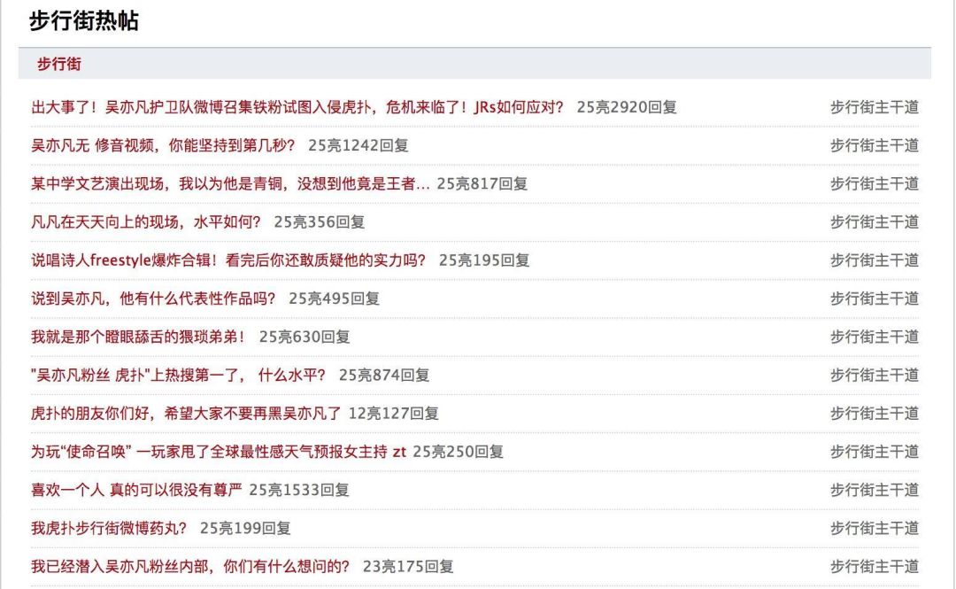 在《虎扑遇上吴亦凡》的文章下,作者木村拓周写道:“说白了,饭圈外的人,有哪一个真的喜欢、欣赏饭圈的组织模式和行为模式呢?但带着一股青春期男生特有的无畏,步行街和JRs 站稳了这个立场。”